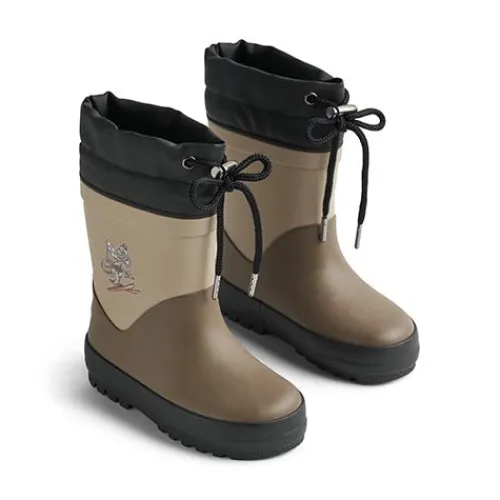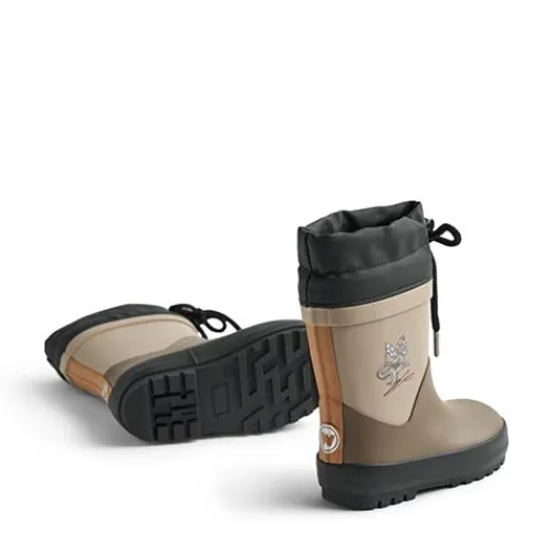 Lækker Dry Wood Dino termostøvle med en overdel af naturgummi i blokfarver (color blocking), dekoreret med dinoprint på ydersiden af skaftet samt et Wheat-logo bagpå, der desuden er en refleks. Det høje skafts åbning er kantet med et bredt stykke vandtæt stof øverst, som kan strammes med en snøre, så støvlen sidder til omkring barnets ben. Indvendig har støvlen et blødt fleecefoer af 30 % naturuld og 70 % genanvendt polyester, så fødderne holdes varme. Den udtagelige latex-indersål er beklædt med tekstil i 100 % økologisk bomuld, og den fleksible ydersål er stødabsorberende med et fint vejgreb.