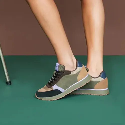 Flot Ronja sko med cool farvedetaljer og et sporty design. Overdelen er af tekstil, ruskind og glat skind med fiskelæderdetaljer ved åbningen. Alt læder er fra LWG-certificeret produktion. Skoen lukkes med snørebånd, og et stort mærke med logo på pløsen fungerer fint som trækfane, så det er nemmere at få skoen på. Åbningen er polstret for øget komfort. Den udtagelige indersål med Wodens karakteristiske kork er polstret og komfortabel, og blødt PU-skum gør indersålen både let og stødabsorberende, imens en Airflow-indersål sikrer åndbarhed og giver en ultrablød gangoplevelse hele dagen. Den formstøbte ydersål i EVA er beklædt med gummi, som giver et godt fodfæste.