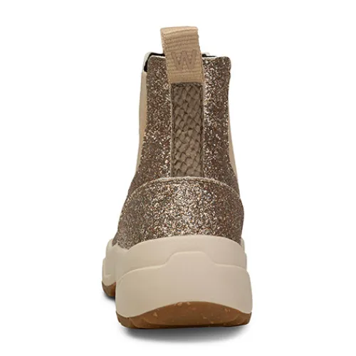 Silje Glitter er en glamourøs ankelstøvle af tekstil med multifarvet guldglitter. Brede elastikpaneler på inder- og ydersiden af anklen giver støvlen en god tilpasningsevne, og trækfaner både for og bag gør det nemt at træde i støvlen, som har en detalje af fiskeskind bag på hælen. Der er brugt blødt PU-skum til den udtagelige indersål, som både er let og stødabsorberende, og indersålens WODEN airflow huller sammen med ydersålens Natural Soft-teknologi sikrer en god åndbarhed i støvlen samt en høj komfort. Støvlen er udformet i et letvægtsdesign, og ydersålens gummibelægning samt det grove mønster giver et godt fodfæste.