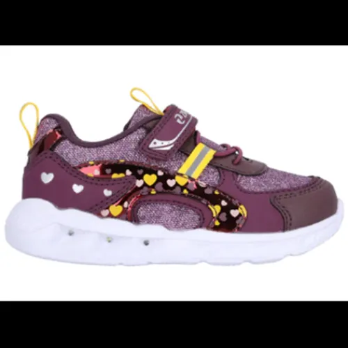 Sneakers fra ZigZag med lys i sålen. En velcro og elastiksnører. Regnbue farvet m rosaguld detaljer, hjerter på yderside og på hæl.